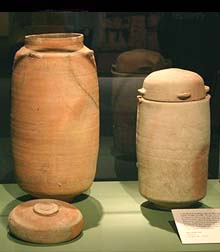 | This is a picture of jugs in which the scrolls were stored. In these jars, in the dry heat of Judean desert, the scrolls went through almost no variation in temperature and humidity. The conditions allowed the scrolls to survive for 2000 years. When they were removed from the caves, the scrolls immediately began to deteriorate.
