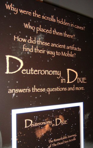 ![]() | An Exhibit of Biblical Proportions in Mobile, Alabama aka "Deuteronomy in Dixie" This was the largest number of biblical scrolls ever to be shown in the United States in one exhibit. It included sections of Genesis-Exodus, Leviticus, Numbers, Psalms, Isaiah, Jeremiah, and Deuteronomy. It was a comprehensive exhibition that interprets the full story of the Dead Sea Scrolls. 12 scrolls were on display from the collection of over 100,00 fragments excavated from the caves near the Dead Sea. These were the real 2000-year old documents. They were on loan from the Israel Antiquities Authority (IAA). This was an exhibition of priceless treasures - not of gold or jewels - but of powerful works scribed millennia ago in the Judean desert. It featured The Oldest Surviving Texts of the Bible. The exhibit was in Mobile January 20 to April 24, 2005 (95 days) at the Gulf Coast Exploreum (www.exploreum.net)